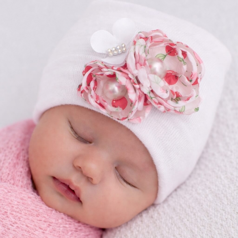 Χαριτωμένο σκουφάκι για νεογέννητο κοριτσάκι με μοναδικό print κεράσια, ιδανικό για την έξοδο από το μαιευτήριο. Διακοσμημένο με χειροποίητα λουλούδια που προσθέτουν ρομαντική και κομψή πινελιά, προσφέρει άνεση και στυλ στις πρώτες εμφανίσεις του μωρού σας.